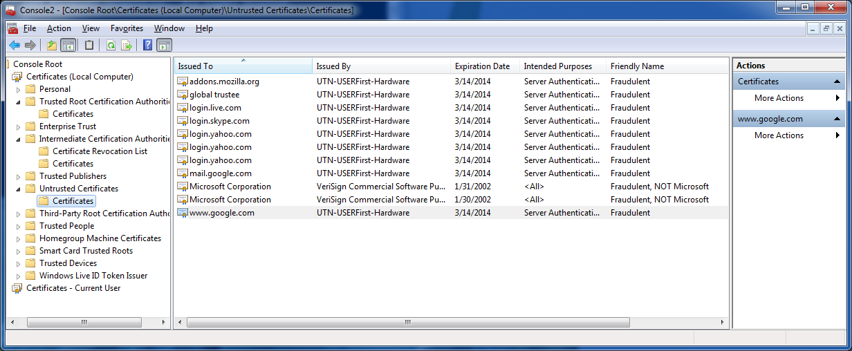 Second even those web browser configured to check may not be capable of using OCSP. In particular Windows XP does not support that feature, which means that clients that rely on the platform crypto functionality such as IE and Chrome, will fall back on using certificate revocation lists instead. The forged certificate contained both an OCSP responder and a CRL distribution point listed; in principle there are web server logs from the CDP– assuming DigiNotar was logging these. While the FoxIt report makes no reference to these additional records, there is an additional problem in that a CRL download is not specific to a particular certificate. It is known that the attackers successfully obtained bogus certificates capable of impersonating several popular websites including Tor and Microsoft. Nothing in the protocol reveals which bogus certificate a client is trying to ascertain the status for. In fact it may even be a “legitimate” user looking up the status for a valid certificate.