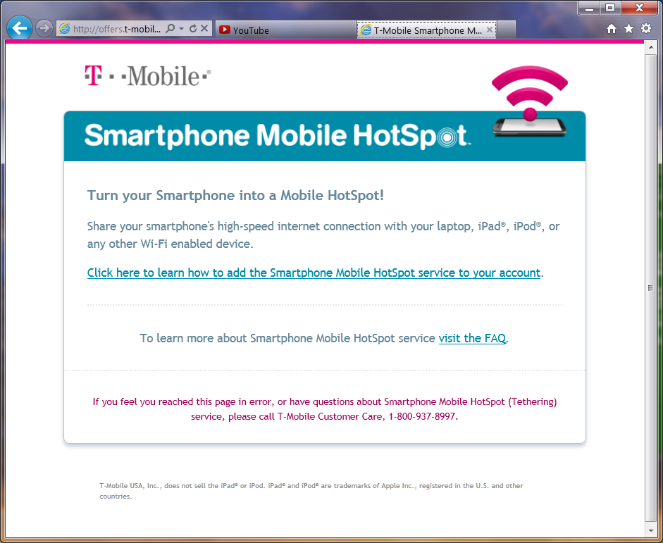 This is not exactly new. Carriers have been frequently at odds with their own users over tethering. Most recently Verizon got a shellacking from the FTC in a recent settlement ruling that the carrier can not keep customers from downloading tethering apps. AT&T meanwhile has resorted to stalking users with SMS when they start tethering on jail-broken iPhones. T-Mobile seems to have taken matters into its own hands by actively manipulating and blocking traffic. The carrier is using an explicit redirect, as the address bar shows a T-Mobile URL instead of the original location. This is accomplished by returning an intermediate response to the request for YouTube, redirecting the browser to the T-Mobile site instead. (With more nefarious transparent interception, T-Mobile could have returned the same bogus response while impersonating the original site the user expected to visit.)