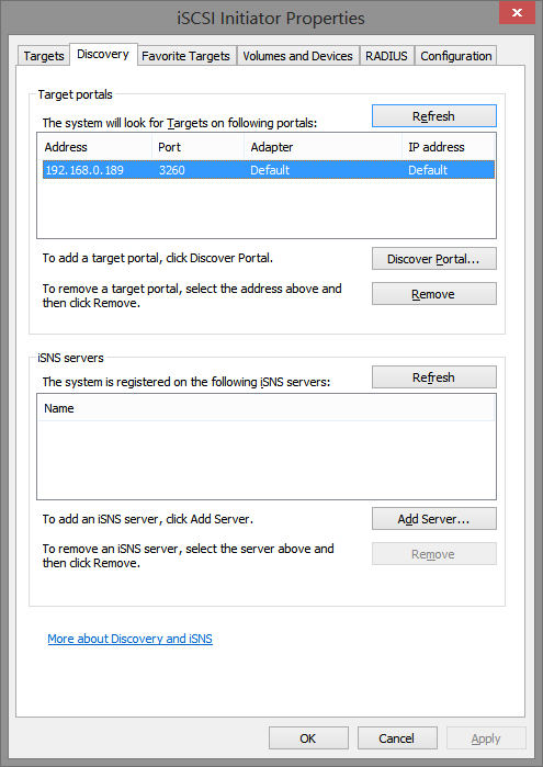 - Switching back to the “Targets” tab and if necessary clicking “Refresh” shows the iSCSI targets located at that portal. A single server can offer multiple iSCSI targets; in the above example we only configured one target backed by one virtual disk.