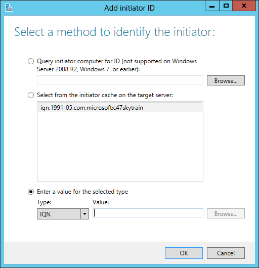 - The dialog will also prompt for the expected ID of initiators connecting to this target. There are multiple ways to identify an initiator, none of them particularly intuitive. Easiest option is to copy paste the iSCSI Qualified Name or IQN style address that is automatically generated by each Windows instance acting as initiator. This name can be obtained from the “Configuration” tab in iSCSI Initiator Properties dialog, which is shown in the screenshots below. (For now skip any additional authentication settings.)