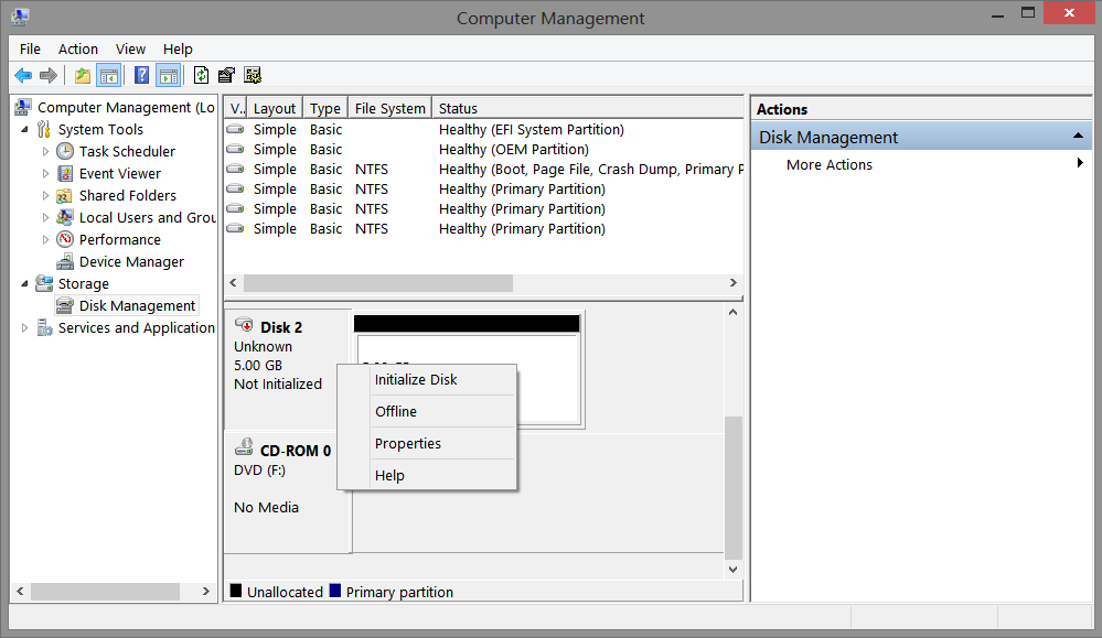 - Fixing that requires a few more steps. These are strictly one-time initialization procedures that permanently setup a file-system structure inside the VHD. They will not have to be performed again when connecting to the iSCSI target in the future. First one is right-clicking and selecting “Initialize disk” from the context menu to initialize the disk. (For this application, choosing GUID partition table over MBR is fine, since the disk can only be accessed by recent vintage Windows instances that support iSCSI anyway.) Second part is creating one or more partitions on the initialized drive. Simplest approach is to allocate the entire space to a single primary partition. Finally the partition is formatted using a file-system such as NTFS.