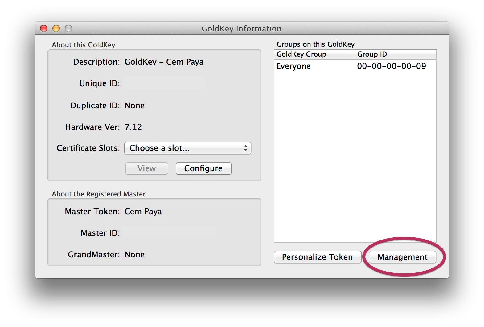 First let’s tackle a simpler problem: clearing an existing token and restoring it to original blank configuration. This turns out to require not just software but hardware support. GoldKey defines a hierarchy of tokens, with regular tokens managed by a master and masters in turn managed by a grandmaster token. Master tokens can perform administrative operations on a plain vanilla token. This functionality is accessed via the “Management” button under GoldKey information:
