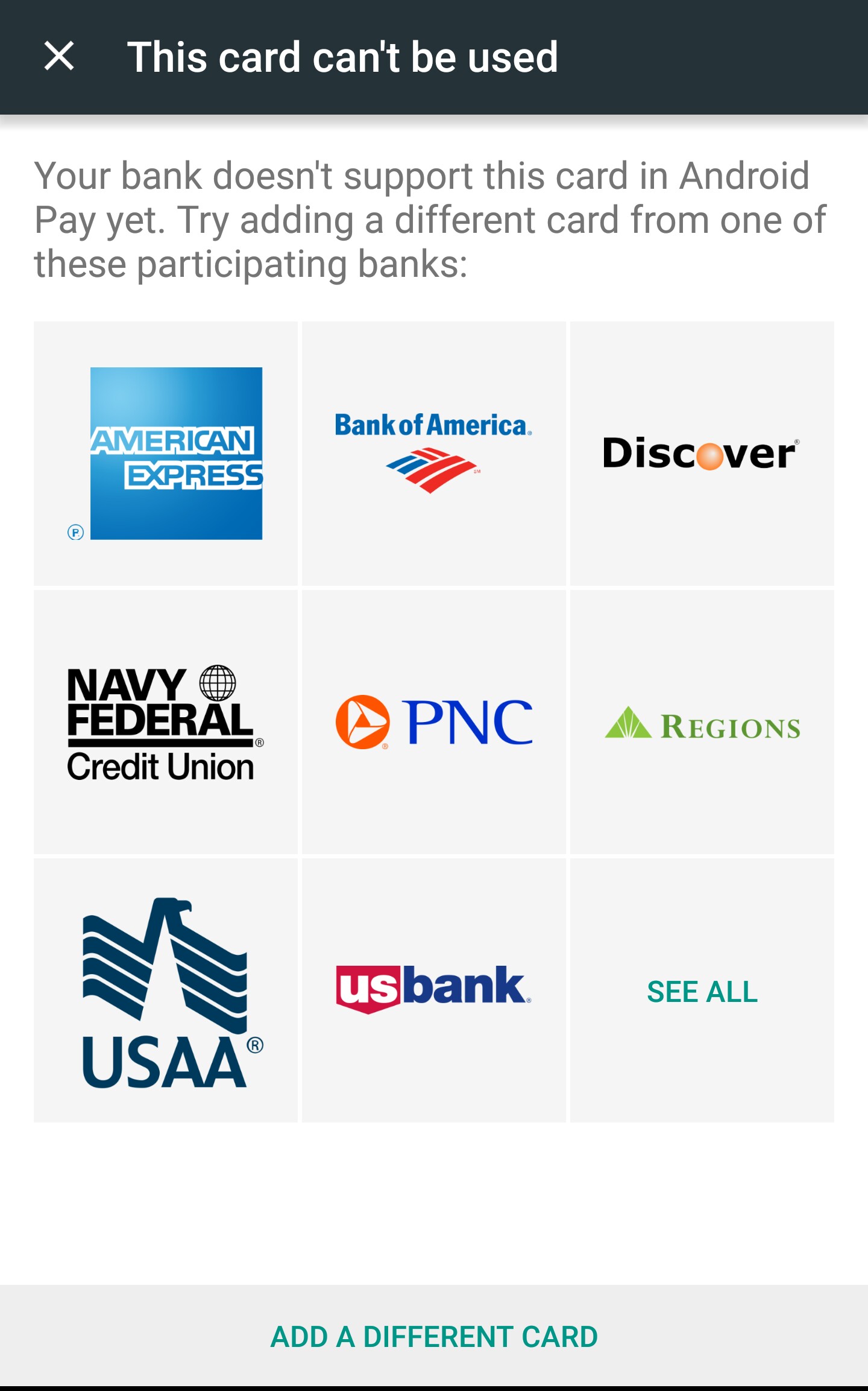 This blogger recently upgraded to Android Pay, one half of the mobile wallet offering from Google. The existing Google Wallet application retains functionality for peer-to-peer payments, while NFC payments are moved to the new Android Pay. At least that is the theory. In this case NFC tap-and-pay stopped working altogether. More interestingly, trying add cards from scratch showed that was not just a routine bug or testing oversight. It was a deliberate shift in product design: the new version is no longer relying on “virtual cards” but instead integrates directly with card issuers. That means all cards are not created equal; only some banks are supported. (Although there may have been an ordinary bug too— according to Android Police, there is supposed to be an exception made for existing cards already used for NFC payments.)